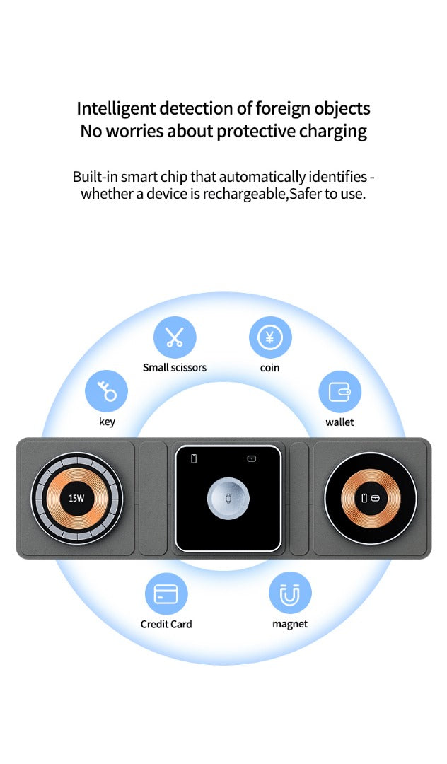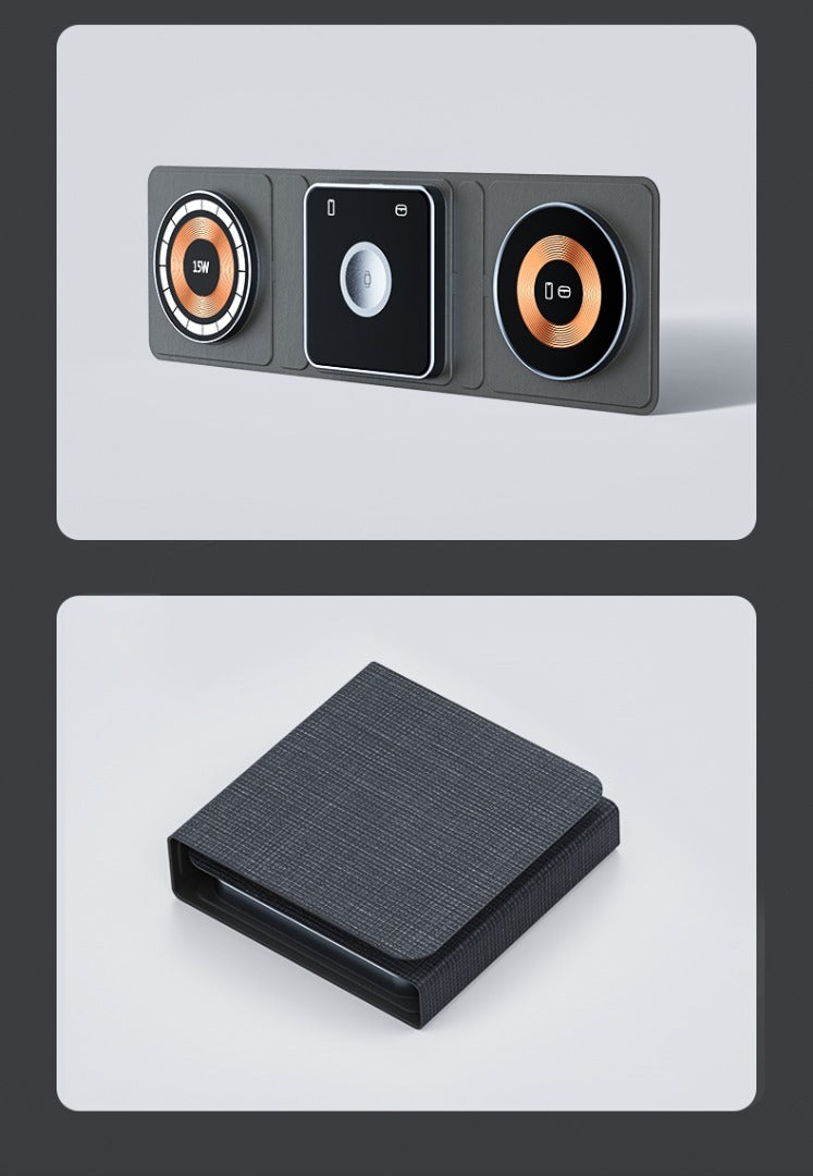 Con capacidades de carga rápida de hasta 15W para teléfonos inteligentes, 5W para auriculares inalámbricos y 3W para el Apple Watch, el Minimalist Foldable 3-in-1 Charger garantiza un rendimiento excepcional en cualquier situación. ¡La solución perfecta para mantener tus dispositivos Apple cargados y listos para usar en todo momento!